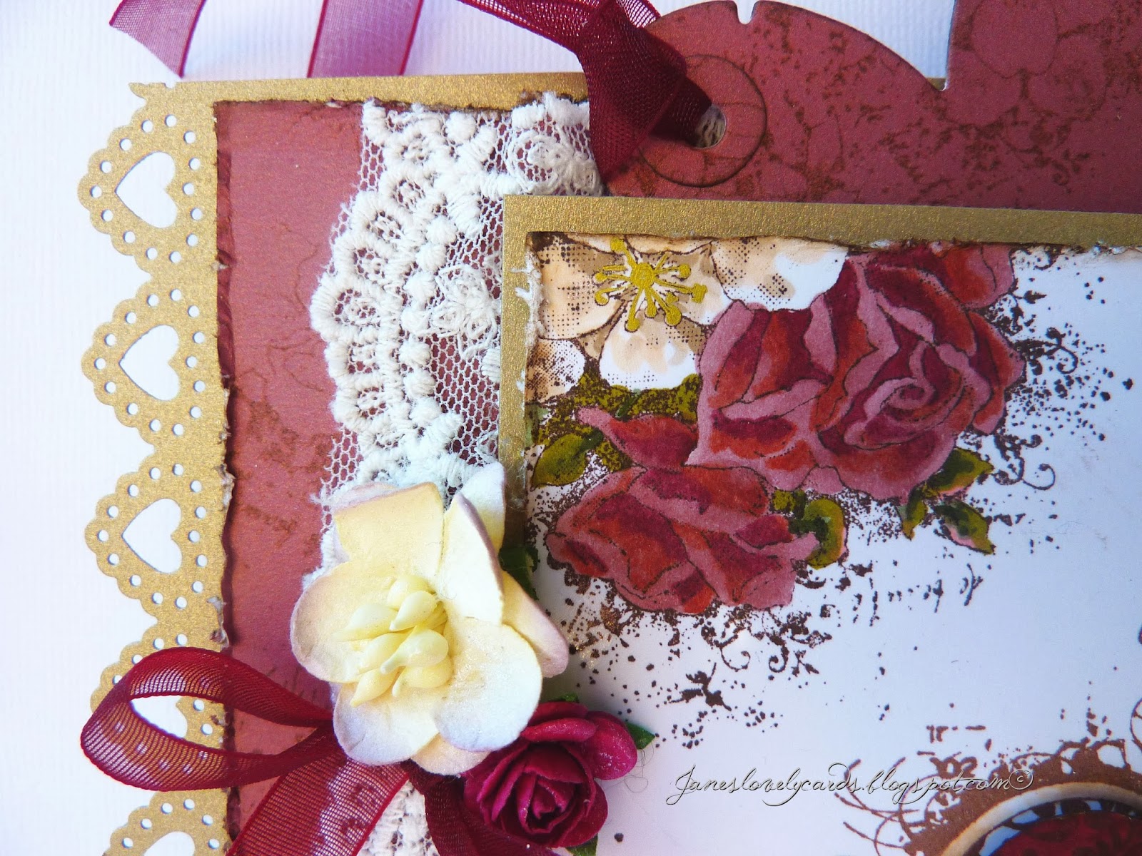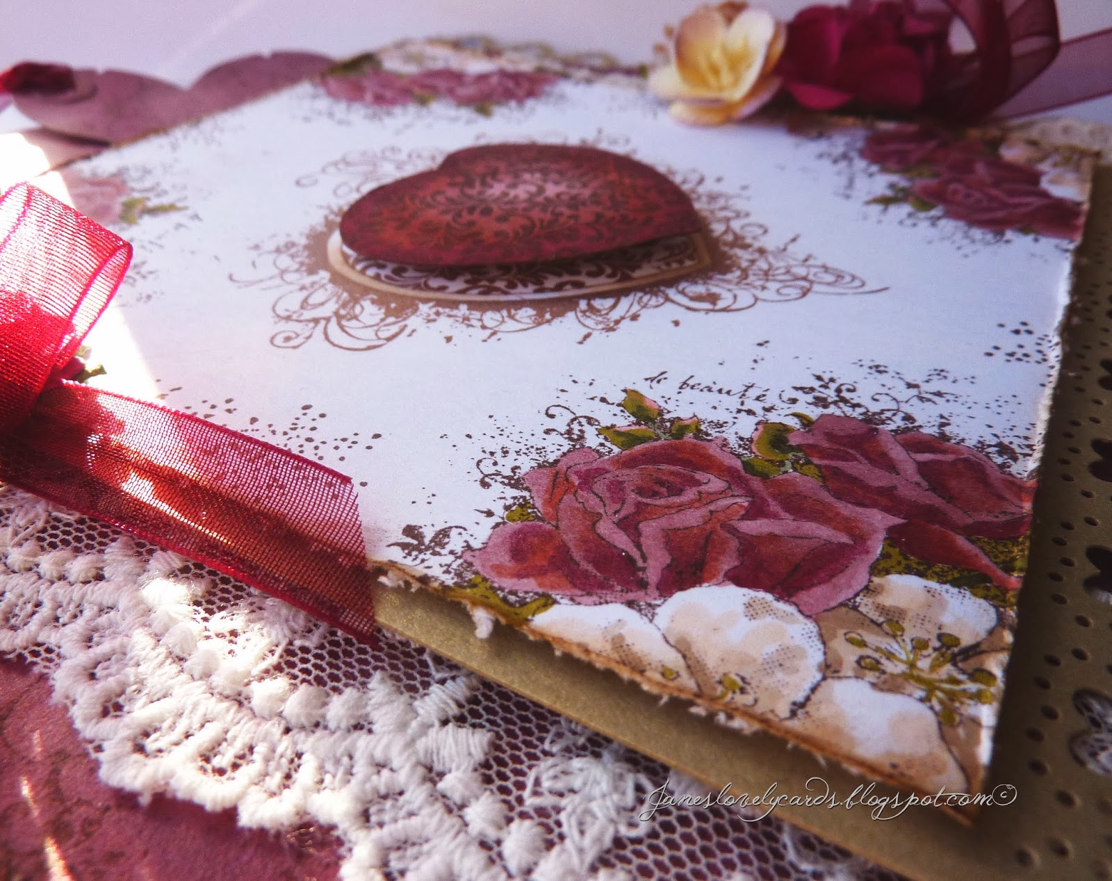 I have used Martha Stewart Heart Lace punch along the edges of the card and the bottom of the image. The lace is from The Ribbon Girl and the flowers and ribbon are from my stash.