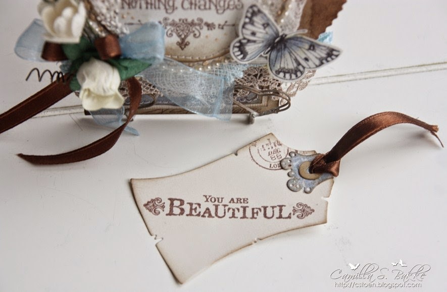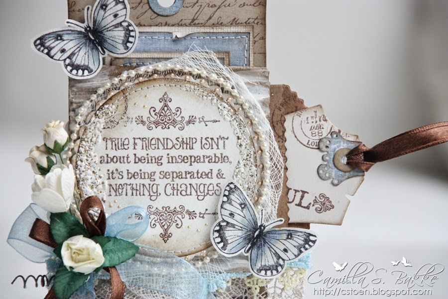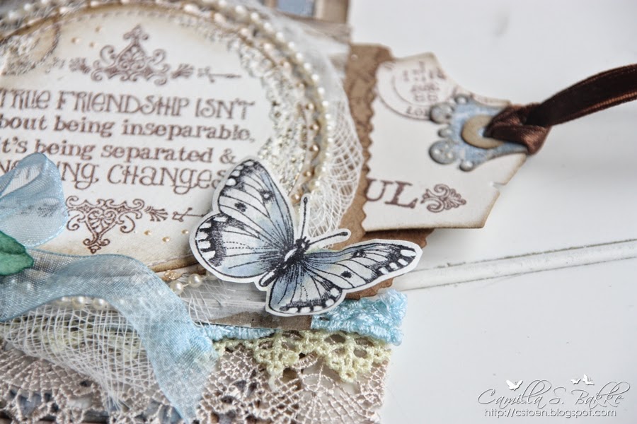Teksten er stemplet med Memento-Rich Cocoa. Mens sommerfuglene er stemplet med Archival Ink-Jet Black på et kaffefilter. Jeg har så malt det med Distress Re-inkers, Weathered Wood, godt utvannet.