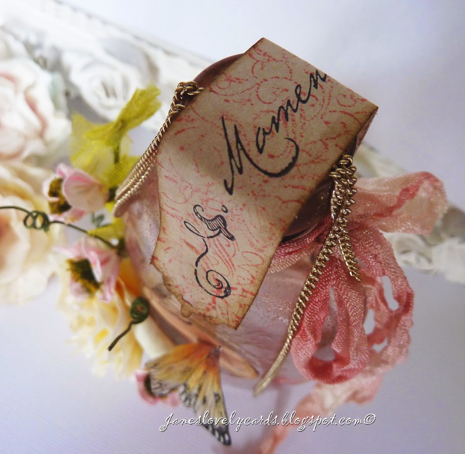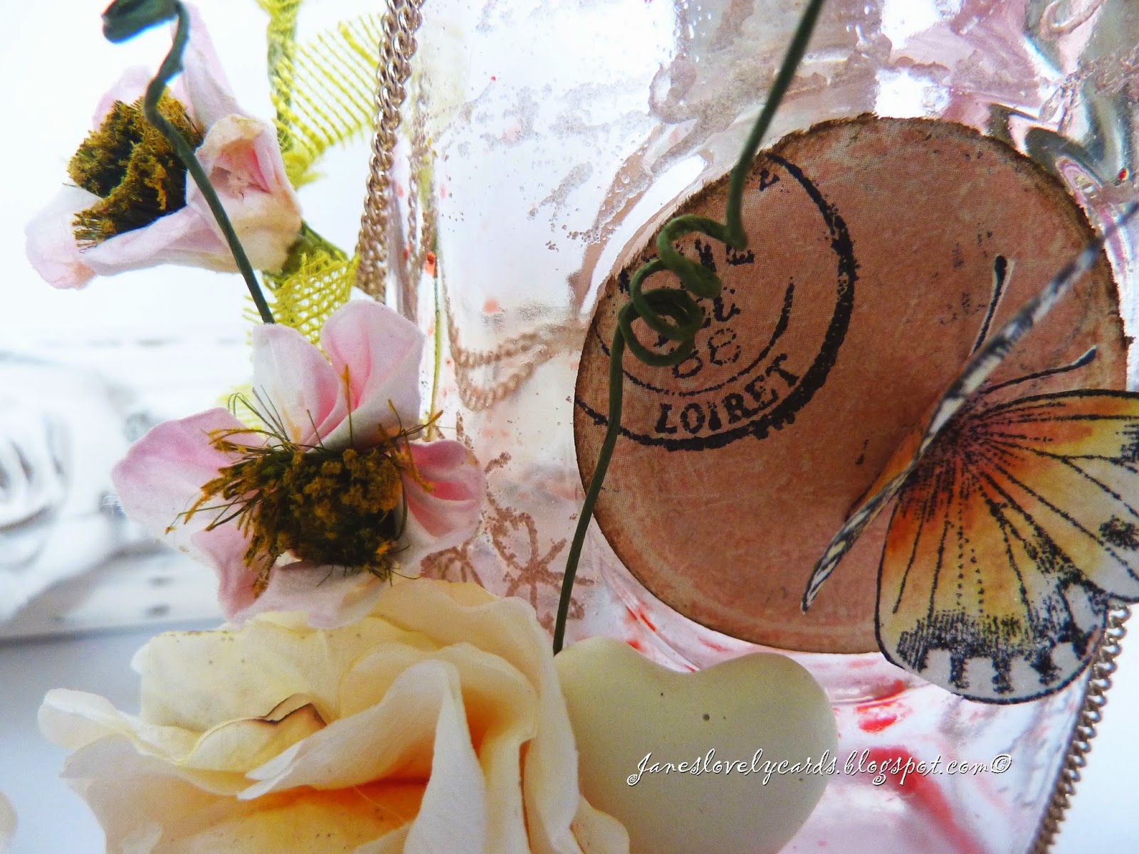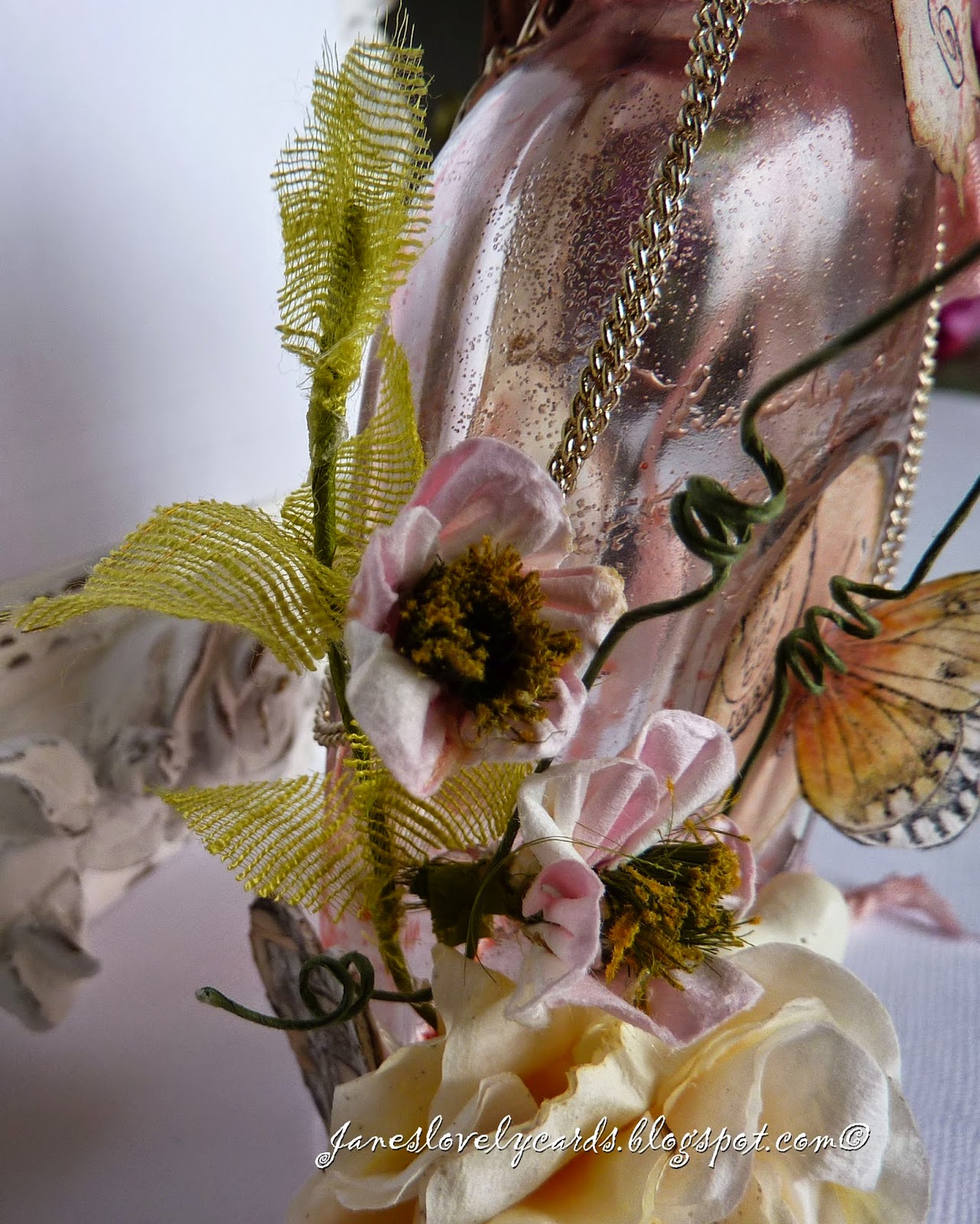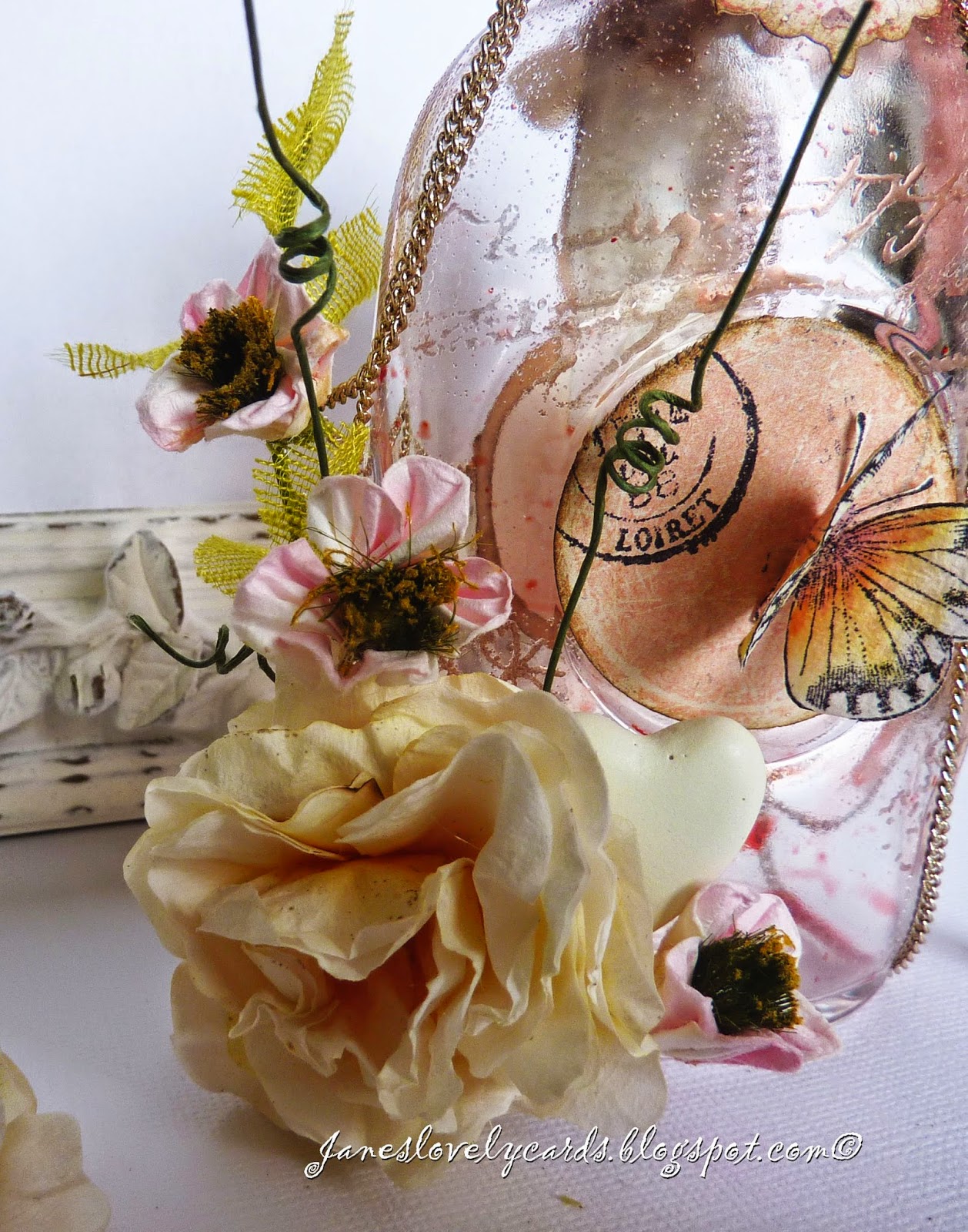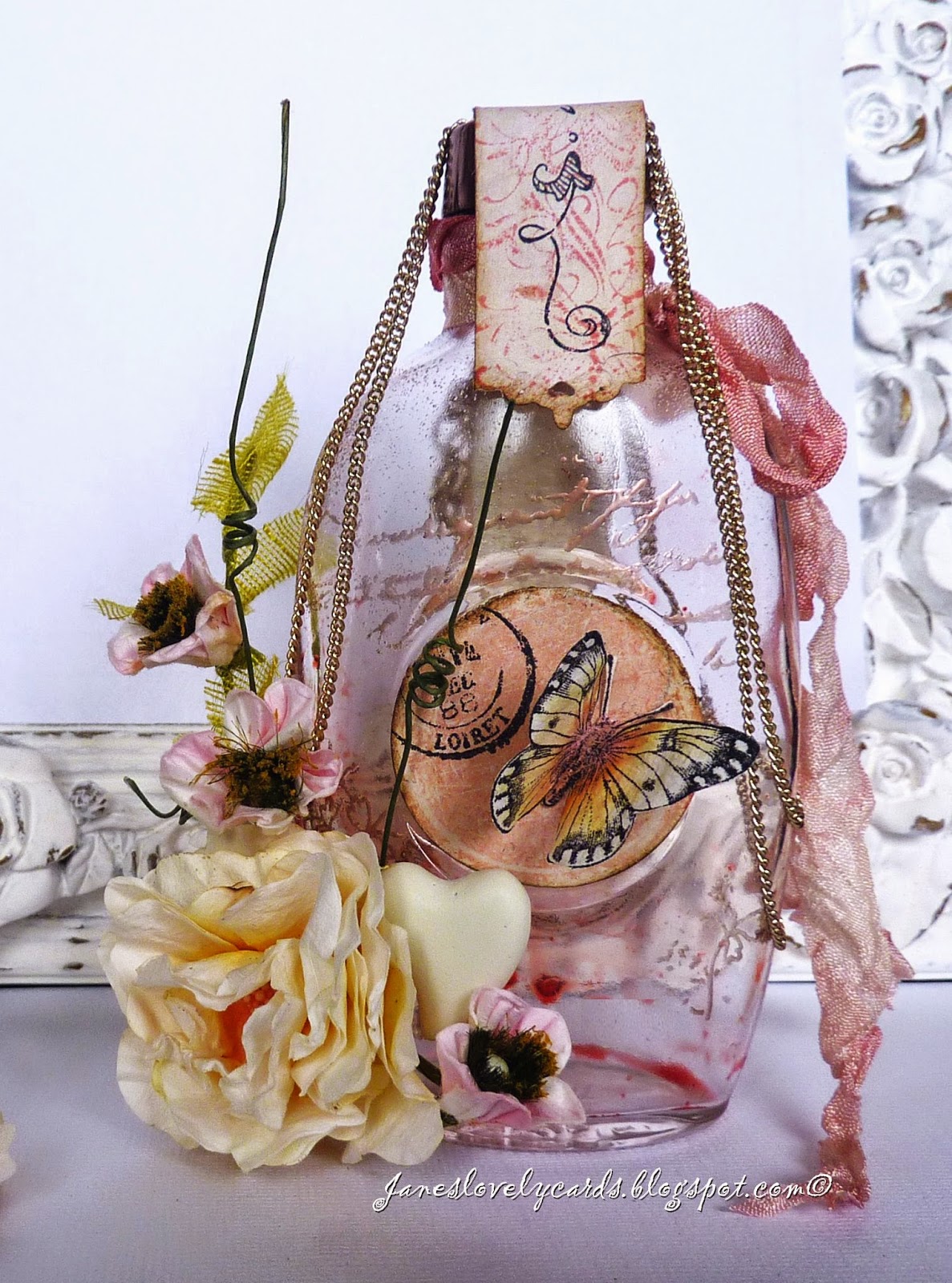 few months and it has been over a month since I was able to create anything (the last few blog posts were created well in advance). It was so relaxing to be able to sit at my craft desk on Friday and create this gift for my Mum's birthday. I was inspired by the incredible bottles that Ingvild Bolme creates and have wanted to make one myself ever since I saw them. My original idea was that I would suspend the necklace I bought inside the bottle but it didn't fit through the neck!