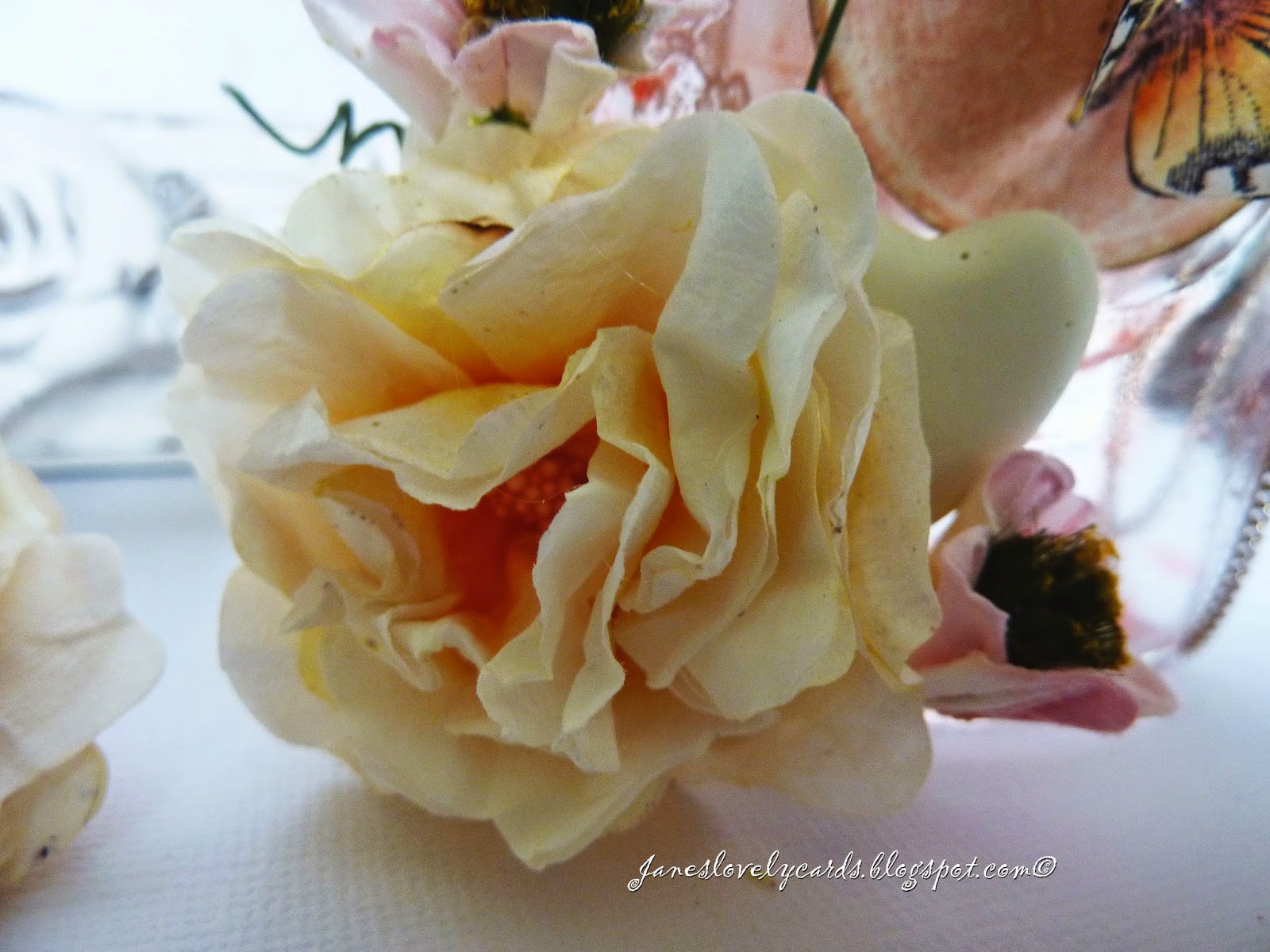 I used the stunning butterfly stamp from Vintage Baby to make the butterfly. It is stamped onto coffee filter paper and coloured with Distress Ink Markers. The little heart is from Live & Love Crafts.