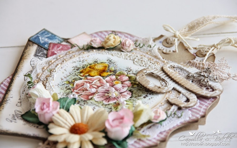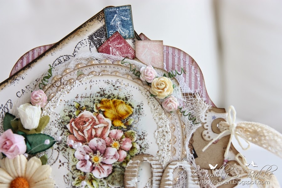 Motivet med blomstene er fra kolleksjonen Vintage Garden. Det er fargelagt med Distress Ink , re-inkers på Langton Akvarell papir. Jeg har også påført litt FranTage rundt motivet. Og Crackle Accents på noen av rosene.