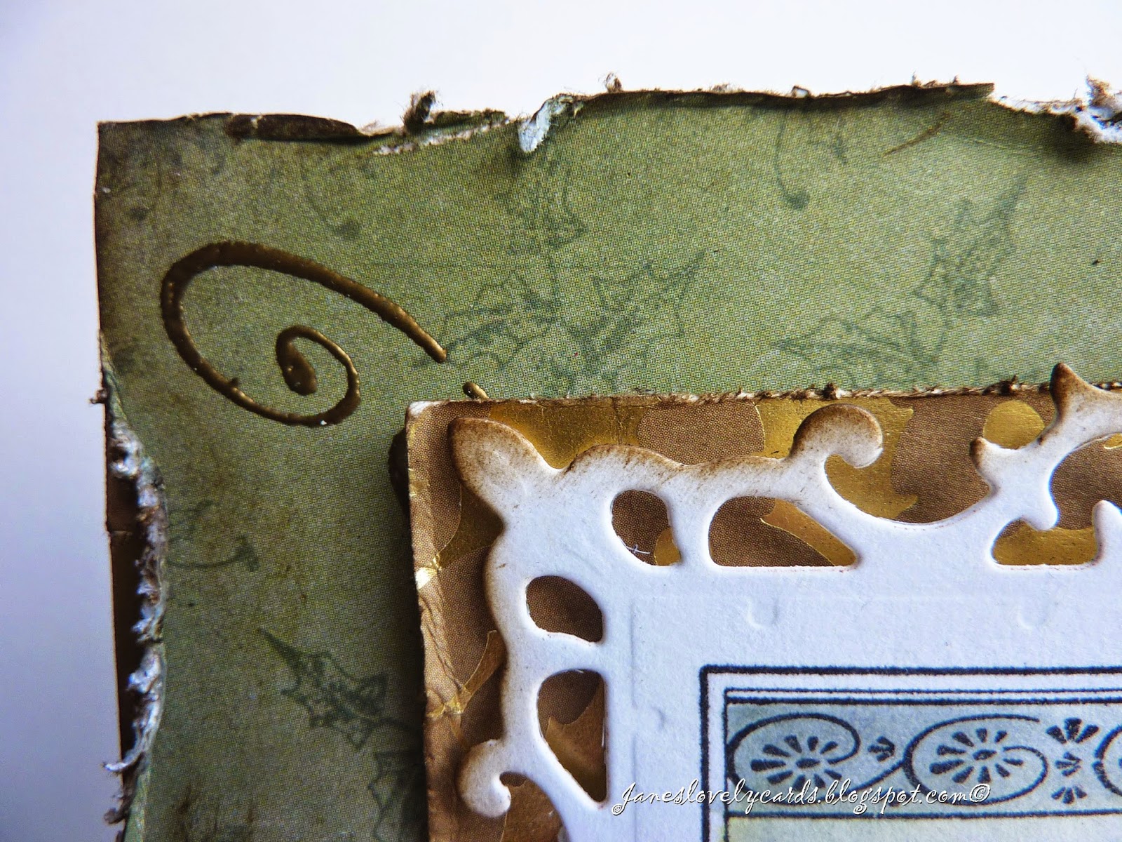 I have distressed the edges of the green paper and inked them with Walnut Stain distress ink. The gold paper is by K&Co.