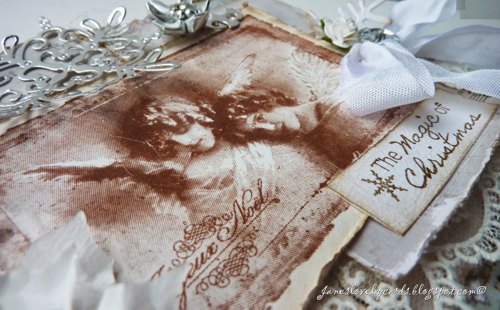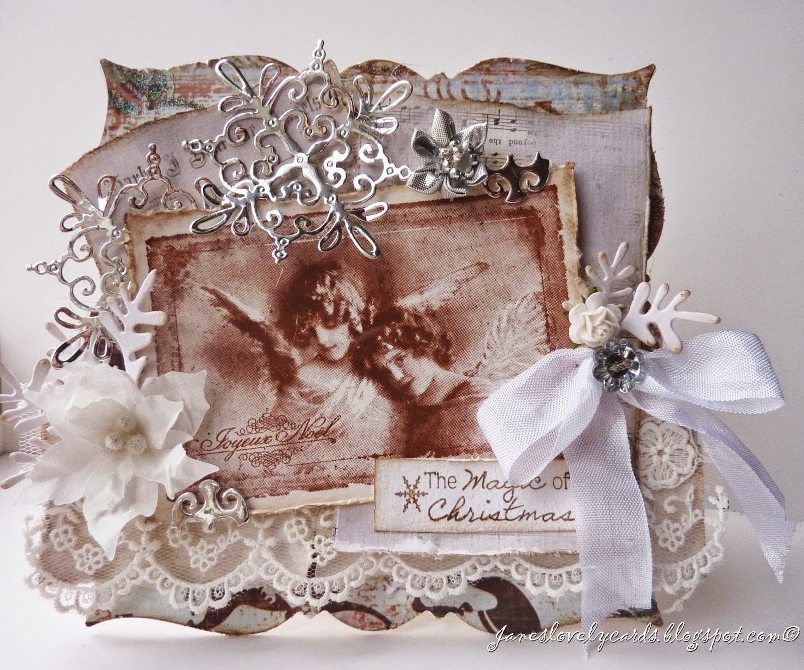 I have used a doohickey snowflake die to cut snowflakes from silver card and I've also used some of the offcuts from the snowflake to make little tabs on the photo image. The silver flower is from The Ribbon Girl.