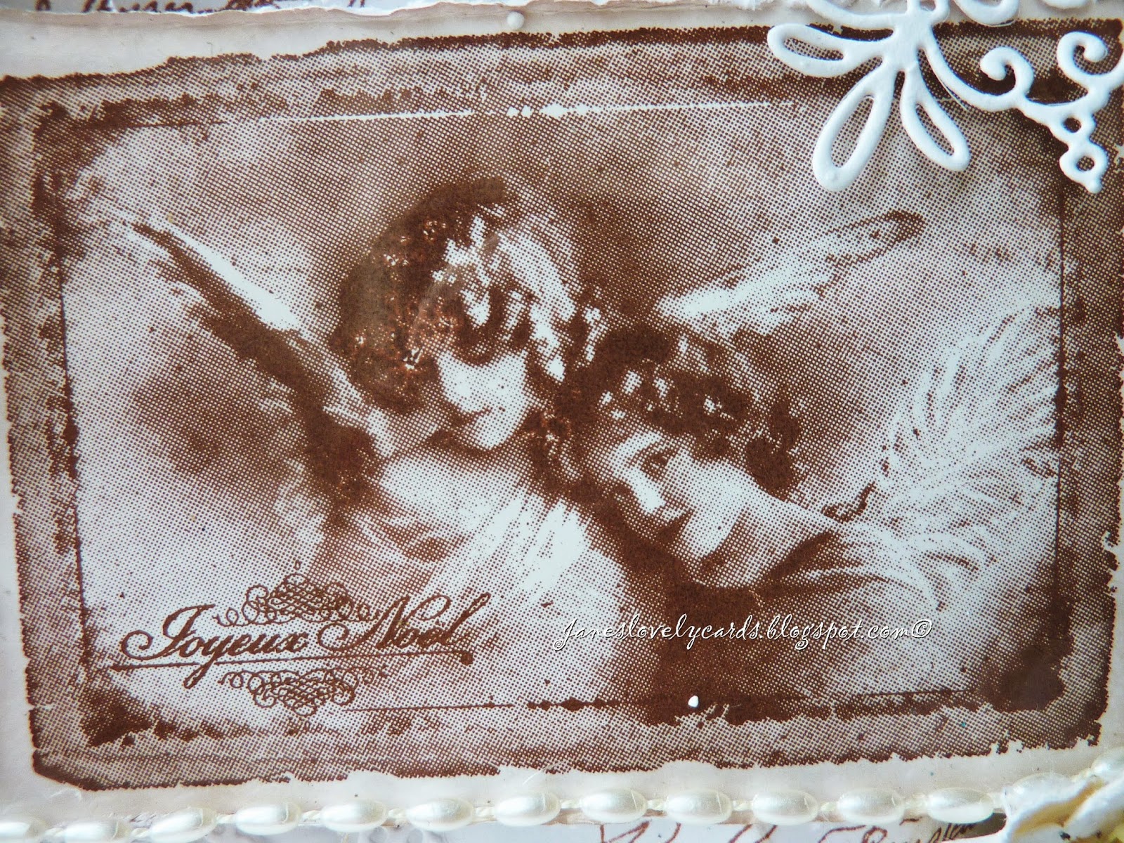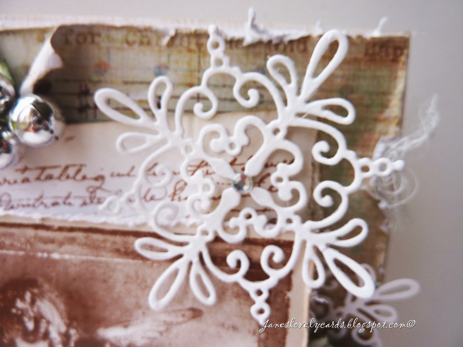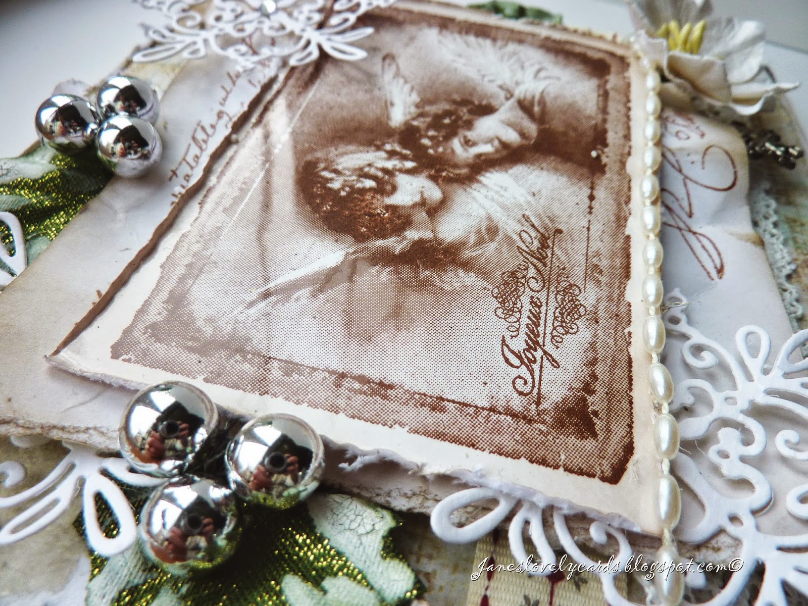 The hellebore and snowflake charm are from my stash. The lace, pearl trim and holly leaves are from The Ribbon Girl (the holly leaves come with a poinsettia flower). Behind the image I have used the French Letter stamp from the Postcard from Paris collection.