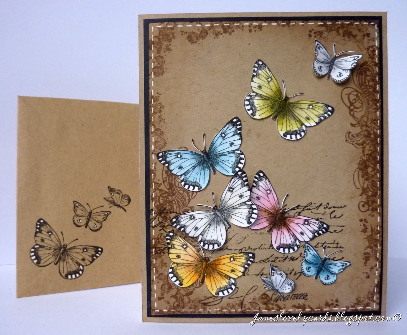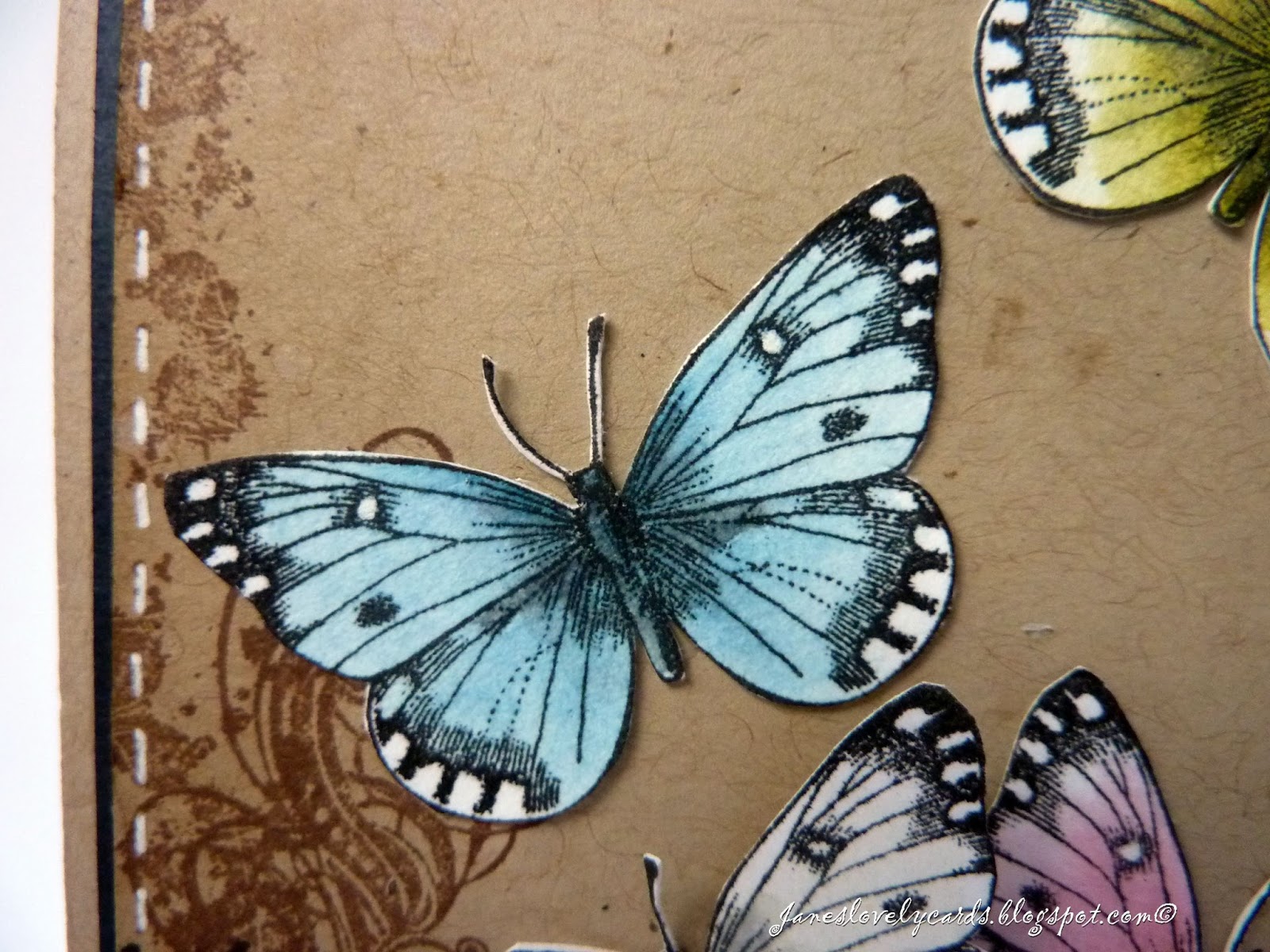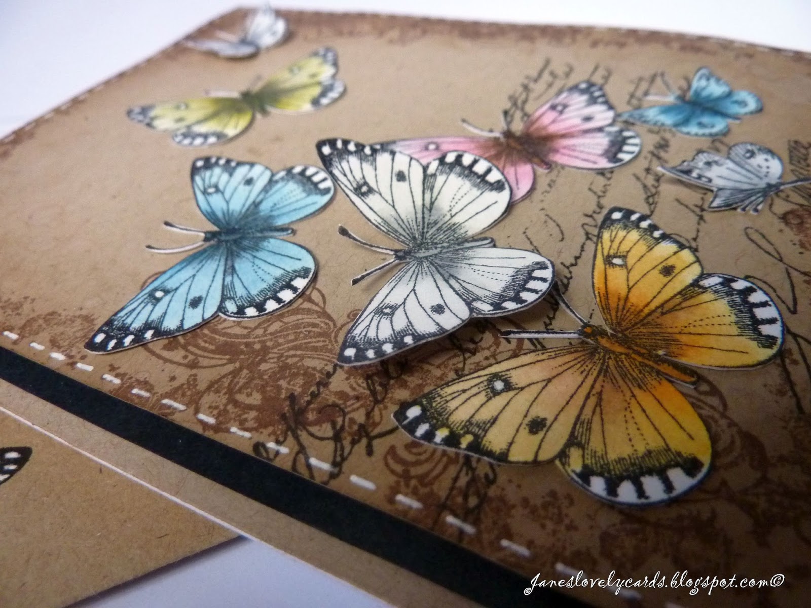 All of the butterflies were stamped with stamps from the Vintage Baby set. I have stamped them onto watercolour paper and painted them with Distress Inks before cutting them out. All of the butterflies are completely stuck down except the white ones. I wanted to give the effect that the coloured butterflies were part of the paper and some 'live' white butterflies had landed to join them! The handwriting behind the butterflies is the French Script stamp from the Post Card from Paris set.
