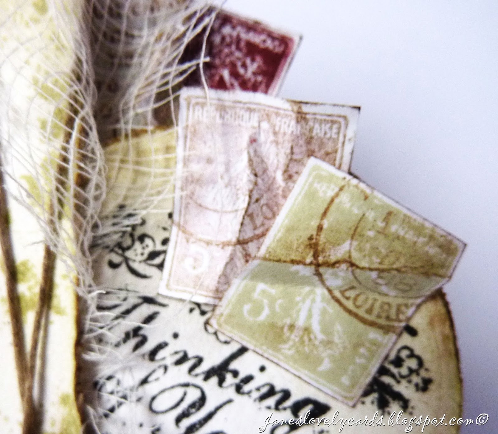 I stamped the postage stamp in different colours and then stamped the postmark over the top. I then creased and aged the stamps with Walnut Stain Distress Ink.